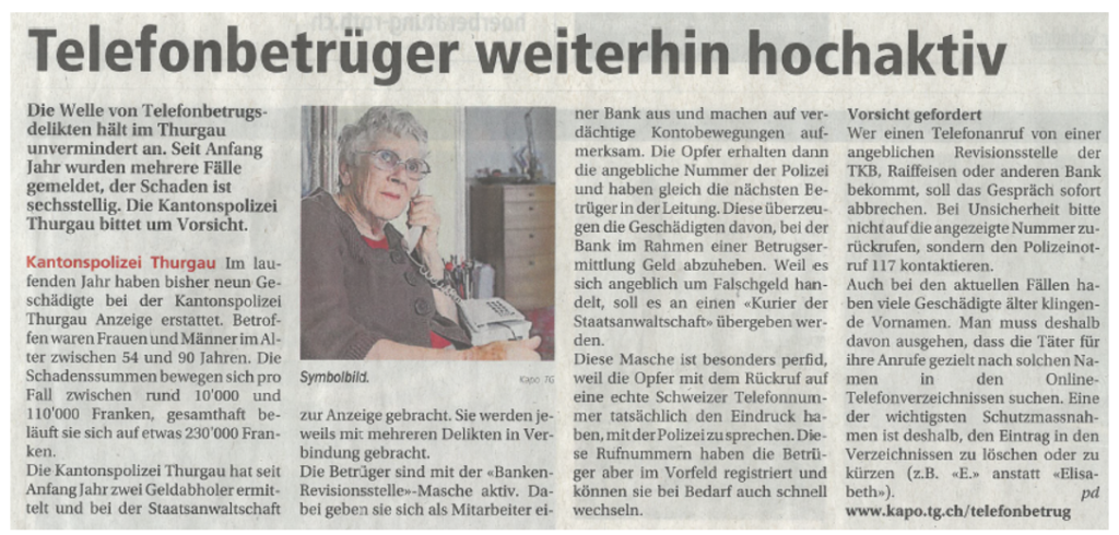 „Telefonbetrüger weiterhin hochaktiv“ 24. Februar 2026 Quelle: Oberthurgauer Nachrichten Ausgabe: 19.02.2026